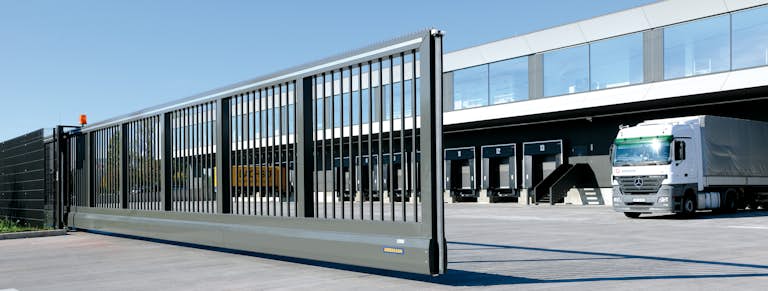 I cancelli scorrevoli Hörmann con stabili profili in acciaio sono disponibili come elemento completo con una larghezza d'apertura di fino a 16 metri. Così in caso di impianti in contromarcia si può raggiungere una larghezza di 32 metri. La struttura è autoportante. I vantaggi: lavori sulle fondamenta ridotti. Nessun montaggio delle guide, nessuna anomalia di scorrimento del cancello in caso di neve, ghiaccio o sporco. In tutte le varianti di portone è integrata di serie una funzione soft-start per il controllo degli impulsi con avviamento delicato del portone, che protegge il portone e i componenti della motorizzazione.